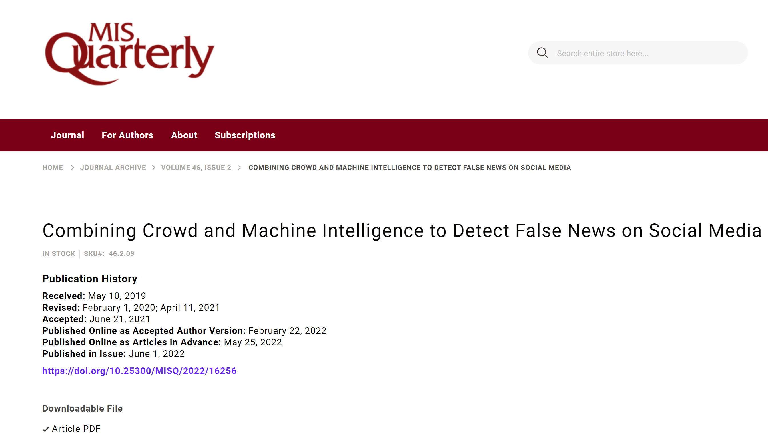 2022年6月,上外管院信息管理与决策科学系张明月副教授,以共同通讯作者身份在信息系统领域顶级期刊MIS Quarterly发表论文“Combining Crowd and Machine Intelligence to Detect False News on Social Media”(Volume 46, Issue 2, 2022, 977-1008,https://doi.org/10.25300/MISQ/2022/16256)。