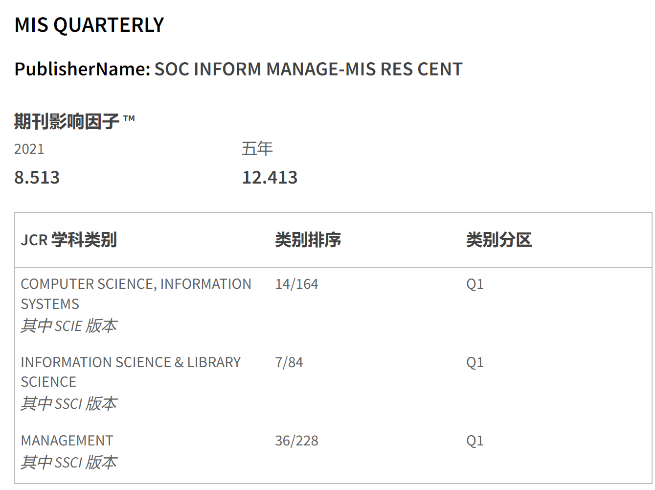 《MIS Quarterly》是信息管理领域排名第一的顶级期刊,具有较高的学术声誉,五年影响因子为12.413。该期刊是美国德克萨斯大学达拉斯分校遴选的24本商学院顶级学术期刊(简称UTD 24)之一,也是金融时报评定出的50本商学院顶级期刊之一(简称FT 50)。
