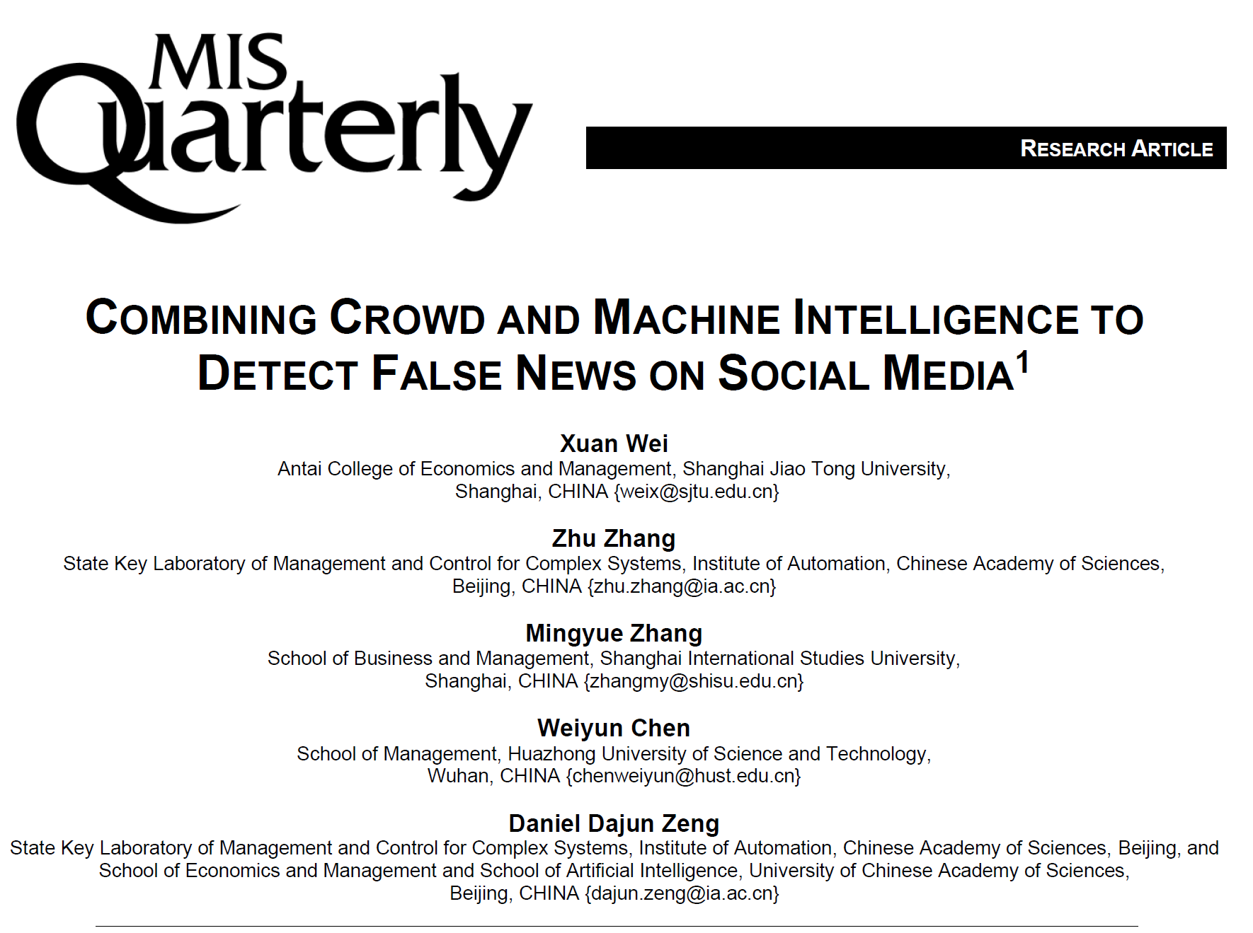 Wei, X., Zhang, Z.*, Zhang, M.*, Chen, W., & Zeng, D. D. (2022). Combining Crowd and Machine Intelligence to Detect False News on Social Media.MIS Quarterly, 46(2), 977-1008.