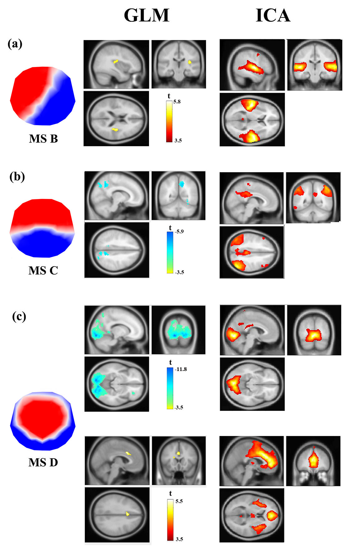 通过多模态数据融合分析得到微状态的时间序列和功能磁共振(fMRI)数据的相关空间分布模式,发现只有四个微状态中只有三个与fMRI功能网络相关,如图2中所示。MS B与听觉网络相关,MS C与执行控制网络相关,MS D则对应了视觉和凸显网络,而MS A没有对应的功能网络。