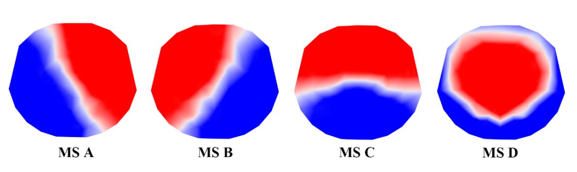 脑电图微状态也存在于睡眠过程中,然而在睡眠过程中微状态和大脑功能网络的对应关系还不可知,本课题组首次发现了深睡眠状态下微状态与大脑功能网络间的关联。申请人发现在深睡眠状态下存在四个与静息态相似的微状态,如图1所示。并且在深睡眠状态下,上-下分布的微状态(MS C)占主导地位,它的持续时间,所占比重,全局解释方差和平均相关系数都远高于其他三个微状态。