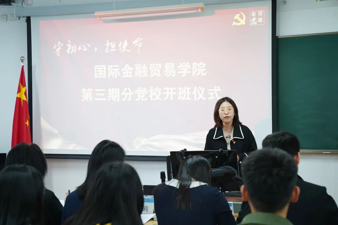 10月26日,国际金融贸易学院组织举办第三期分党校开班仪式。出席本次开班仪式的有国际金融贸易学院党委书记戴迪萍,国际金融贸易学院党委副书记夏卡莉,国际金融贸易学院专职组织员王瓅苑,国际金融贸易学院分团委书记靳贞玮。开班仪式由本科生党支部书记白冰主持。