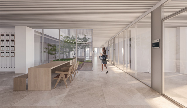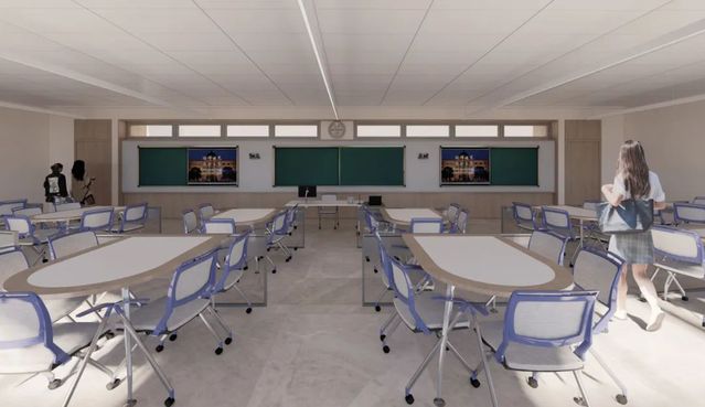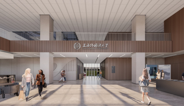 全球治理与区域国别研究大楼总建筑面积18546.5平方米,其中地上建筑面积14212.6平方米,地下建筑面积4333.9平方米,地上部分7层,地下1层,建筑最大高度为33.05m。大楼采用装配式钢筋混凝土框架结构。在功能设置上,包括未来学习中心、智慧教室、多功能报告厅、研讨室、教师工作室、文献资料室和人防地下车库等。
