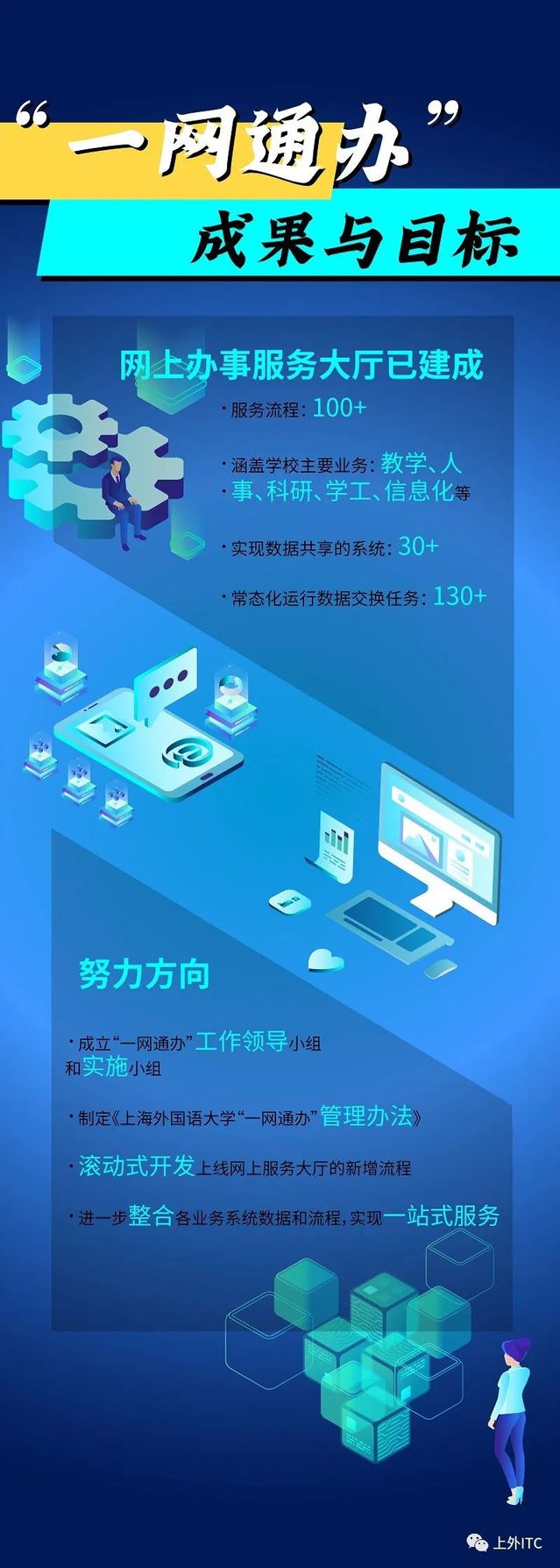 上海市在2018年全力推进“一网通办”的政务服务,将面向企业和群众的所有线上线下服务事项进行整合,逐步做到一网受理、只跑一次、一次办成。这是一项具有开创性意义的政务服务革命。我校也紧跟时代步伐,通过建设“网上办事服务大厅”、“大数据分析及决策平台”、“基于企业微信的移动校园平台”、“个性化信息门户”等公共服务平台,为师生提供统一的流程服务、数据服务、内容服务和消息服务,取得了阶段性的成果,为把我校建成国别区域全球知识领域特色鲜明的世界一流外国语大学作出应有的贡献。