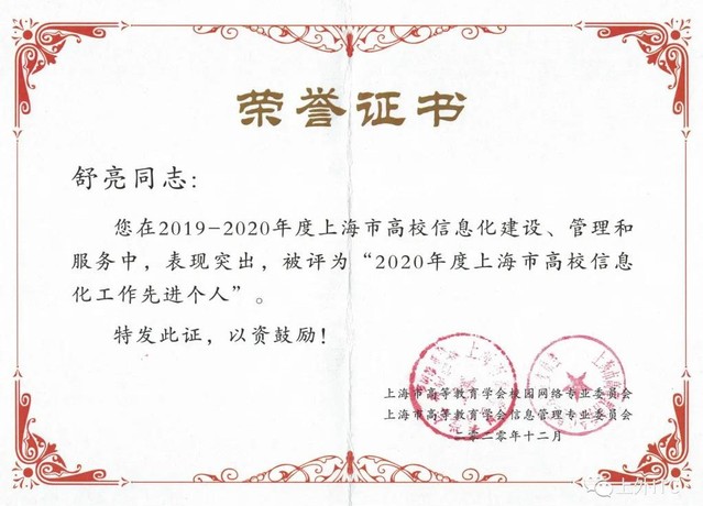 经专家评审,上海外国语大学信息技术中心舒亮同志被评选为“2020年度上海市高校信息化工作先进个人”。舒亮同志在上海外国语大学信息技术中心工作已有十二年,主要负责虹口校区校园网络、数据中心机房的建设、运维和管理工作,参与修订《校园网络管理办法》、《校园弱电系统综合布线技术规范》、《校园弱电机房管理办法》等校园网络管理及技术标准化文件,参与修订校园网络技术路线及用户服务流程,负责拟定校园网络建设项目技术方案。随着近些年校园网络技术的不断发展,在原有工作量不断增加的同时,对个人的技能提出了更高的要求。为保障校园网络系统正常运行,舒亮刻苦学习、努力钻研,不断提升自身的技术水平。为我校的校园网络基础设施建设打下了坚实基础,为师生提供良好的网络服务,保障学校日常教学、科研和管理工作中的网络需求。