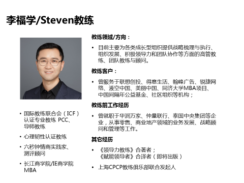 M2项目为期六个月,将通过教练辅导的方法,指导MBAers在自我认知和自我探索中解惑职业发展,加强自我意识,明确职业发展的目标,从导师处寻找专业的职业发展建议,通过导师辅导提升个人领导力和自我管理能力,获得行业深度见解积累更多人脉资源。
