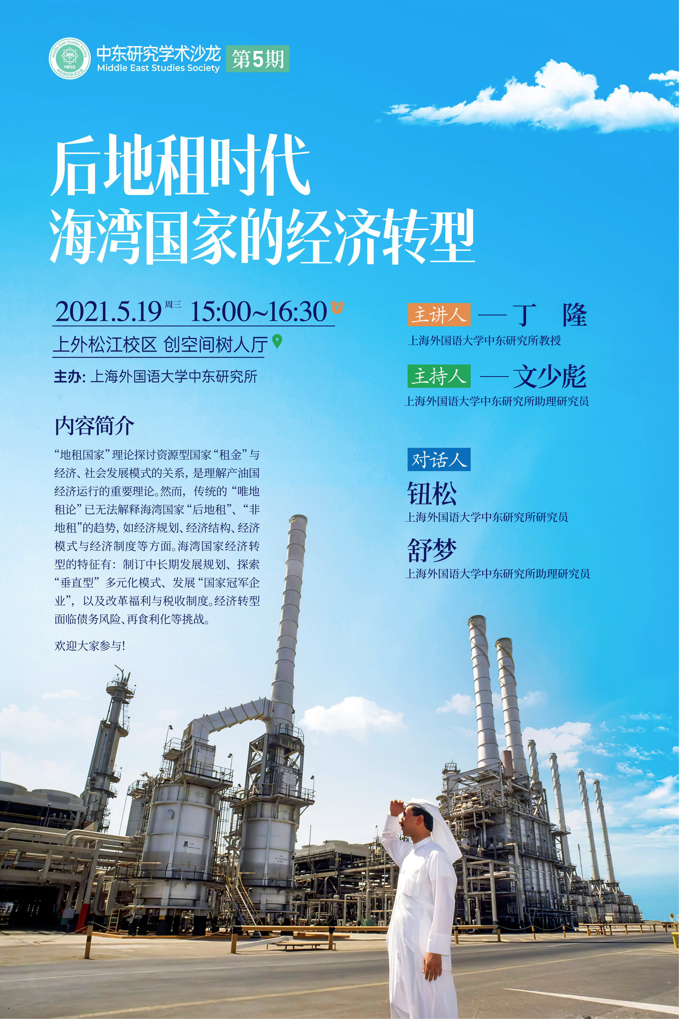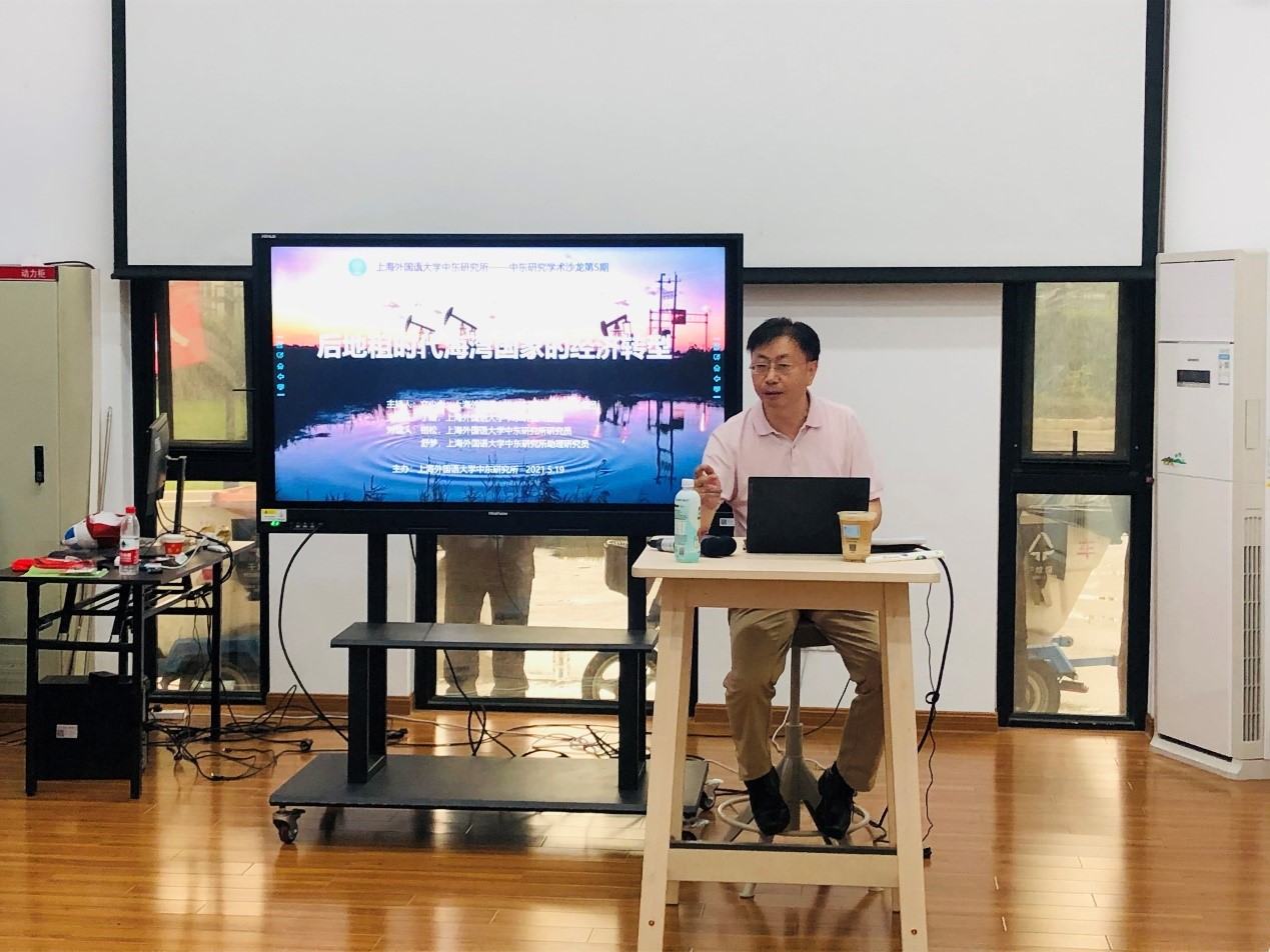2021年5月19日,上外中东研究所主办的“中东研究学术沙龙”第5期在松江校区树人厅成功举办。上海外国语大学中东研究所教授丁隆作了题为“后地租时代海湾国家的经济转型”的学术报告。活动由中东研究所文少彪老师主持,中东研究所钮松、舒梦、潜旭明老师应邀参与对话,来自全校各专业的20多名师生一同参与活动。