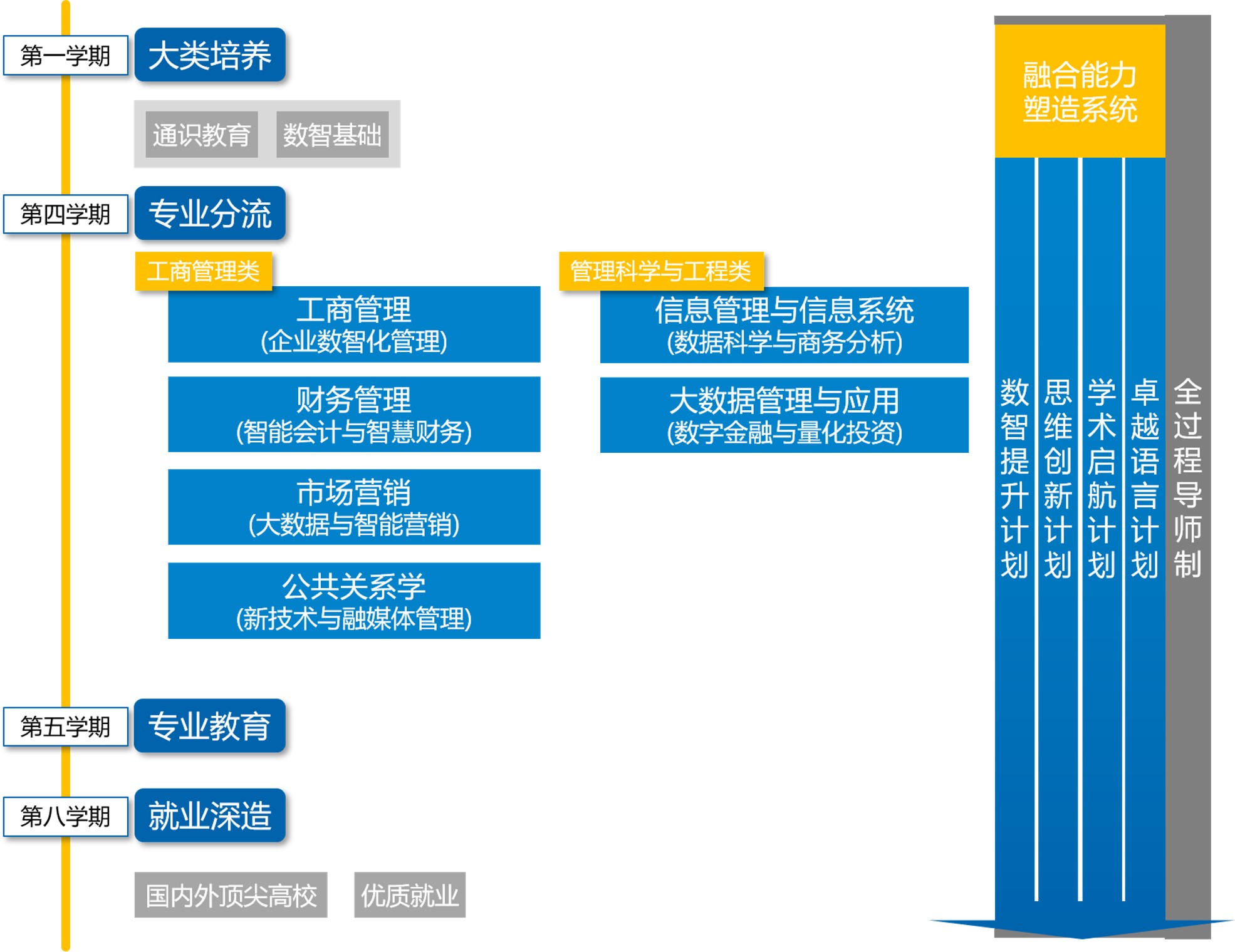 数据科学与智能科学技术的飞速发展持续改变社会形态,推动管理模式颠覆式变革。顺应管理类人才培养“数智化”转型的要求,学院本科项目旨在培养扎实数智基础、精通商务分析、掌握学科前沿、具有持续创新能力的卓越复合型人才。