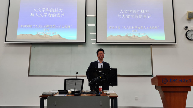 10月17日,上海外国语大学副校长、英语学院院长查明建教授给同学们带来了人文实验班系列讲座的第一讲。该系列讲座立足英语学院人文实验班,面向全校开放,旨在扩大学生的人文和学术视野,提升人文修养。