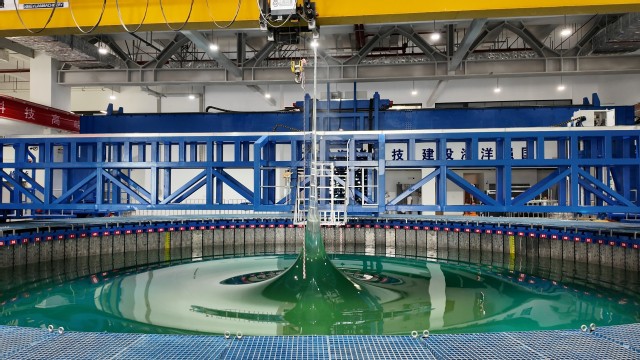 中新网三亚8月24日电 (李欣楠 孙艺菡 粟棱)一道黄色警戒线内,直径27米的圆形水池水面平静。不过十余秒,波澜骤起,水波迅速向中心汇聚、叠涌,转眼间一道白色水柱冲天而上,又骤然落下——这不是真实海洋风暴,而是实验室中对极端海况的精准复现。