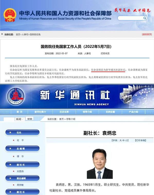 据人社部2022年5月7日消息,我校1987届校友袁炳忠被国务院任命为新华通讯社副社长。
