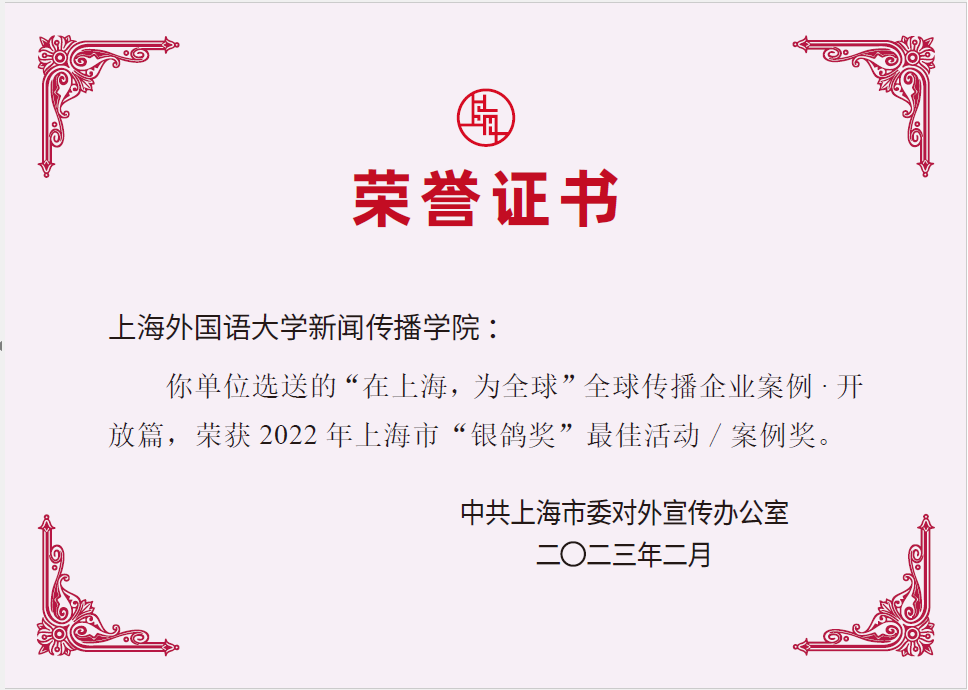 近日,2022年上海市国际传播领域最高奖项“银鸽奖”评选结果揭晓。上海外国语大学新闻传播学院参与报送的“在上海,为全球”系列全球企业传播案例中5个项目脱颖而出,荣获该奖。