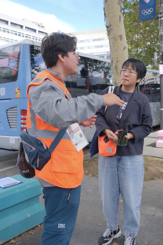 98日,上海外国语大学法国巴黎调研暨背包记者团分成两路开展活动。林岩老师带领部分成员前往贝尔西体育馆。贝尔西体育馆是法国文化和体育的标志性建筑,其金字塔形设计是巴黎风景区的亮点之一。巴黎奥运会期间,体操、篮球和蹦床等项目都在此举办。当调研小队抵达时,体育馆正准备举办轮椅篮球决赛。场馆外,专为残疾人设立的通道旁,排着长长的轮椅队伍,球迷们静静等待入场。在体育场前的小广场上,许多球迷聚集在一起,拍照、聊天,或是在阳光下享受这残奥会最后的比赛日。体育馆周围随处可见残奥会的志愿者。一位年轻的哥伦比亚志愿者表示,他已经在巴黎待了两个月,专门为奥运会和残奥会服务,日常工作完成后,志愿者还能享受入场观看比赛的福利。另一位来自马德里的志愿者拄着拐杖,自我介绍说他来巴黎仅两周,专门为残奥会服务,正在为贝尔西体育馆最后一场赛事工作。晚上,他将转移到法兰西体育场,参与闭幕式的志愿工作。