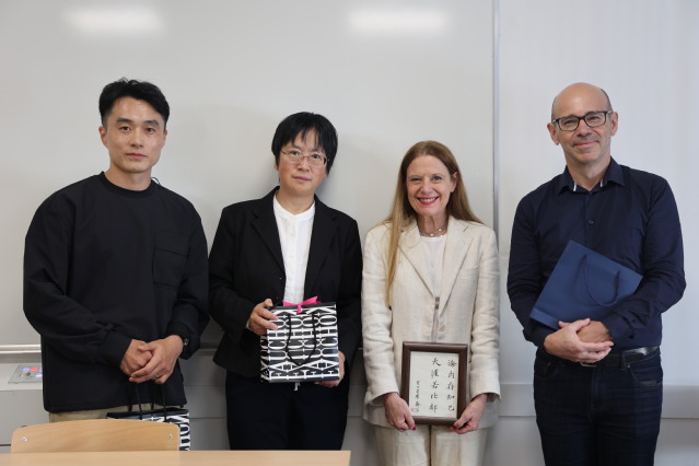 午后,团队成员们来到了本次调研行程中非常期待的环节——访问法国巴黎第三大学(Sorbonne Nouvelle),副校长Françoise Lavocat女士和巴黎三大国际合作亚洲区主任、艺术与文化地缘政治研究生院院长Laurent Martin教授热情接待。见面伊始,双方的老师们以最诚挚的礼节相互致敬,并交换了富有深意的礼物。林岩老师和曹帅老师将精美的书法作品赠予了法国的同仁们,“海内存知己,天涯若比邻”诗句承载着上外对情谊的珍视,象征着两校之间跨越山海的深厚友谊。
