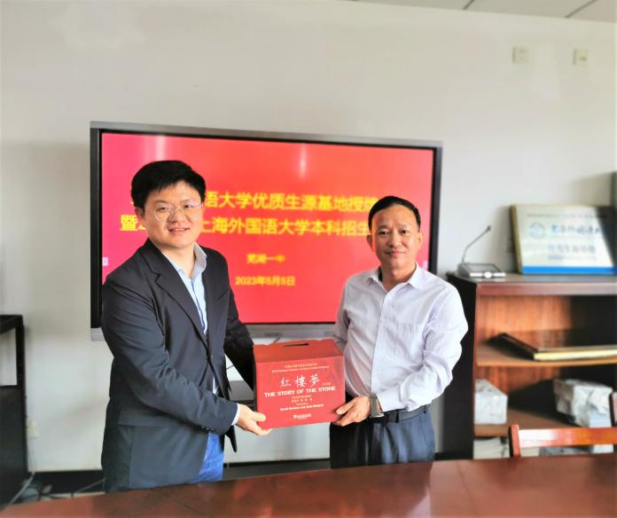 座谈后,安徽招生宣传组代表学校向附中授予“优秀生源基地”牌匾,外教社向附中赠予《红楼梦》(中英对照版)和《黑布林英语阅读》丛书。附中校长助理翟佳、主任叶国平出席座谈和授牌活动。