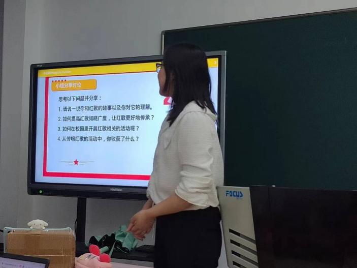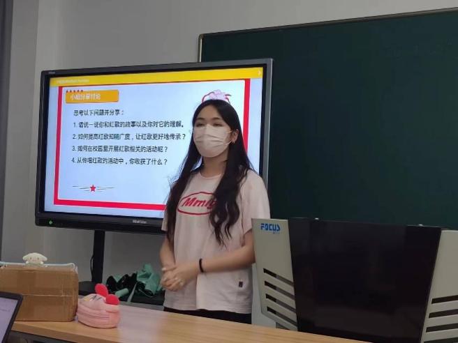 关于“如何更好地传承红歌”,学员李慧芬分享道:“一提到红歌,可能我们的脑海里第一时间想起的是《东方红》《保卫黄河》《在太行山上》等经典名曲,但是不少如《灯火里的中国》《我和我的祖国》等新时代的新红歌也同样唱进了我们的心里。建议通过‘新时期红歌大赛’‘红歌微视频创作大赛’‘红歌背景我知道’等方式宣传新时代红歌,提高红歌的时代性和趣味性,以师生喜闻乐见的方式让红歌更好地传承。”