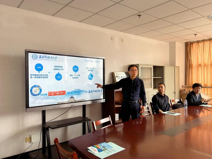 在安徽师范大学附属中学,附中副校长毛宣海对上海外国语大学安徽招生宣传组一行的来访表示热烈欢迎。在座谈交流中,毛宣海副校长介绍了附中的校史和办学特色,希望可以与上海外国语大学开展深度合作,紧密携手,培养出更多有理想、有情怀的优秀学生。何洪武介绍了上海外国语大学的学校概况、院系与专业设置和招生录取情况,并介绍了“优秀生源基地”合作建设的“八大计划”,期待与附中有更多的合作交流,共同培养更多的优秀人才。