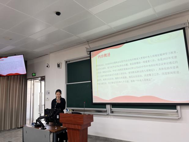 首先,张老师传达了深入贯彻中央八项规定精神学习教育相关通知要求,并围绕历史脉络、现实挑战和实践要求等三个维度带头交流心得体会。