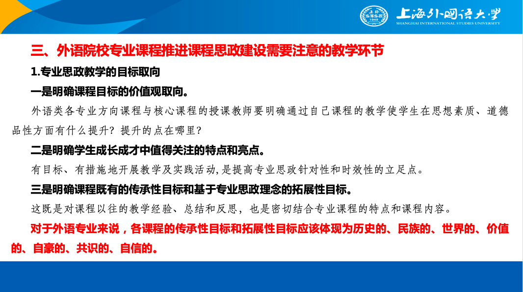 作为首批上海高校课程思政整体改革领航高校之一,上海外国语大学将继续扎实推进上海高校课程思政整体改革领航高校建设:举办“课程思政与课程育人”系列工作坊、打造专业教学课程思政“课程链”、开展课程思政名师示范课教学活动、搭建多语种特色课程思政教学案例库、编制具有外语院校特色的课程思政教学指南。上外将不断思考和探索外语专业人才培养课程思政改革的有效路径,面向全国外语类院校和外语专业教师搭建更多课程思政经验交流平台和成果展示平台,为外语教学传播中国声音提出上外方案、分享上外经验、贡献上外智慧。