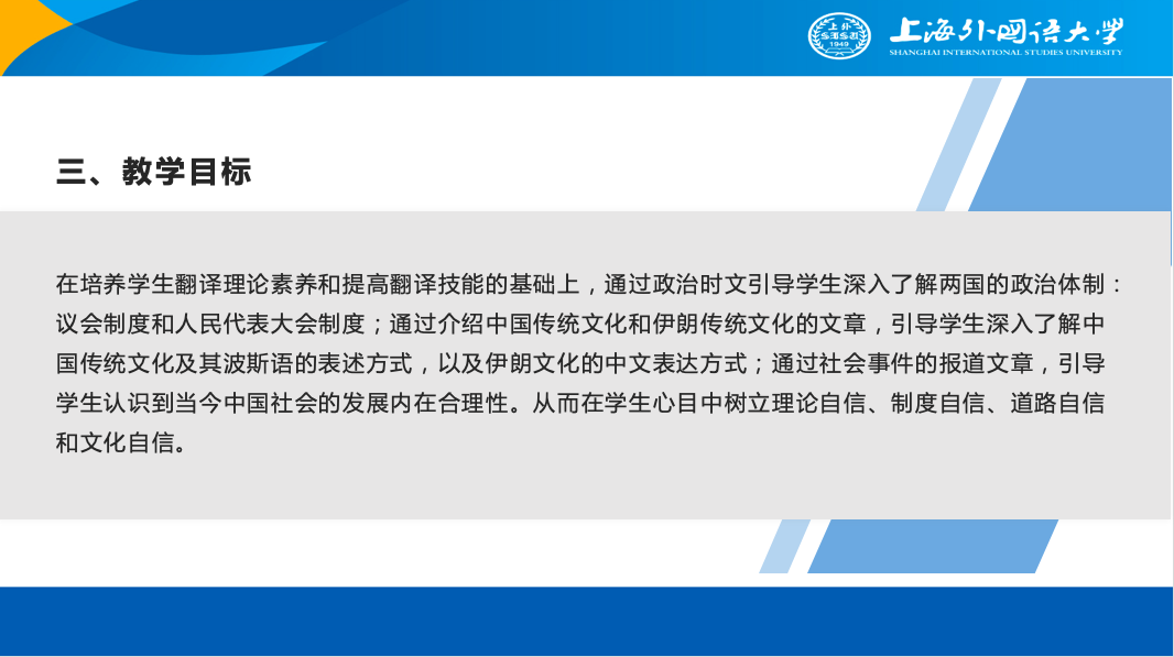 上外东方语学院程彤教授以“非通用外语课程体系与课程思政结合初探”为题,从比较教育学的角度入手,分享了他在非通用外语专业教学中开展课程思政教育教学改革的宝贵经验。他认为,无论是我们现在正在开展的课程思政教育教学改革,还是西方长久以来“学以进德”的教育理论,都一致体现出知识传授和德行培养有机统一的教育观。他结合《普通高等学校本科专业蕾教学质量国家标准》中不同的课程类型,对外语专业课程思政改革进行分类型的解读。程彤以《波斯语时政翻译与理论》课程为例,为外语教师教授翻译课程提供了教学设计思路:选取中国与伊朗的官方媒体时政文章作为教学素材,使在学生掌握汉波翻译的理论和技巧的同时,对两国的政治体制、历史文化、社会发展等方面、对“一带一路”战略的深远意义有更充分的认识,引导学生认识到当今中国社会的发展内在合理性,从而树立“四个自信”。值得一提的是,今年新冠肺炎疫情期间,上外波斯语专业师生主动参与抗“疫”——积极响应翻译需求,翻译制作《抗疫医疗汉波词汇表》,加入中伊防疫互助小组中的视频翻译校对组,真正做到了学以致用,为助力伊朗抗击新冠肺炎疫情贡献了中国青年力量。这正是平日里润物无声的课程思政教育孕育出的喜人硕果。程彤说道:“我们培养的外语人才不但要长着‘中国脸’,还要揣着‘中国心’,不但要爱祖国,还要有‘美美与共,天下大同’的‘大爱’”。