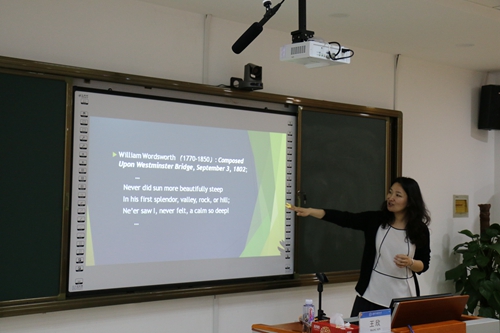 王欣教授用生动的实例着重讲述了如何将人文教育巧妙地融入不同课程的课堂教学中。在谈到英语口语教学时,她选用塞缪尔·约翰逊(Samuel Johnson)的《谈话的艺术》(Conversation)和弗朗西斯·培根(Francis Bacon)的《论谈吐》(Of Discourse)片段,以及《论语》当中的“敏于事而慎于言”,引出话语交往中格莱斯(Paul Grice)提出的“合作原则(Cooperative Principle)”和利奇(Geoffrey Leech)提出的“礼貌原则(Principle of Politeness)”。谈及英美诗歌教学,王欣节选了拜伦(Lord Byron)的《她走在美的光彩中》(She Walks in Beauty)“Which waves in every raven tress”一句,品鉴“wave”的动态美,并同唐诗中的“春风又绿江南岸”中的“绿”和“红杏枝头春意闹”的“闹”字进行类比赏析,指导青年教师在教的过程中,逐步引导学生“由门外到门内,由赏析到批评,将主观个人感悟转化为学术活动”。此外,她还发散思维由《论语》中的“食无求饱”联想到《富兰克林自传》(The Autobiography of Benjamin Franklin)中的“eat not to dullness”,由《她走在美的光彩中》的“One shade the more, one ray the less”联系到《登徒子好色赋》的“增之一分则太长,减之一分则太短”,指出通过联想阅读可以发现中外文化的共通性,激发学生对历史文化的热爱,同时提高学生的审美和翻译能力。